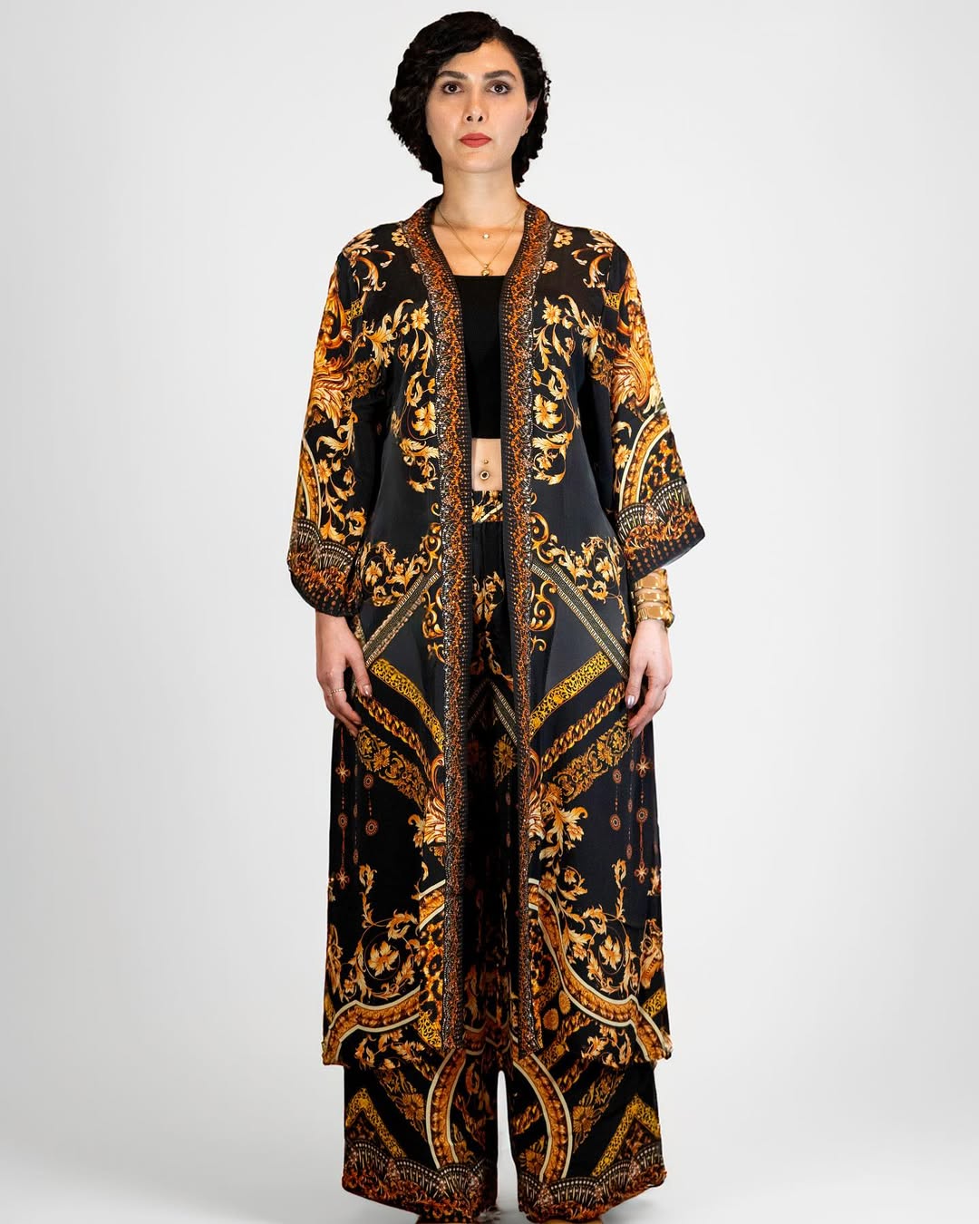 Our Royal print kimono layer with collar comes with the pants set designed by our inhouse artisans , worked with premium crystals on the collar, this kimono layer is cut in a relaxed fit and falls. FABRIC- POLYESTER